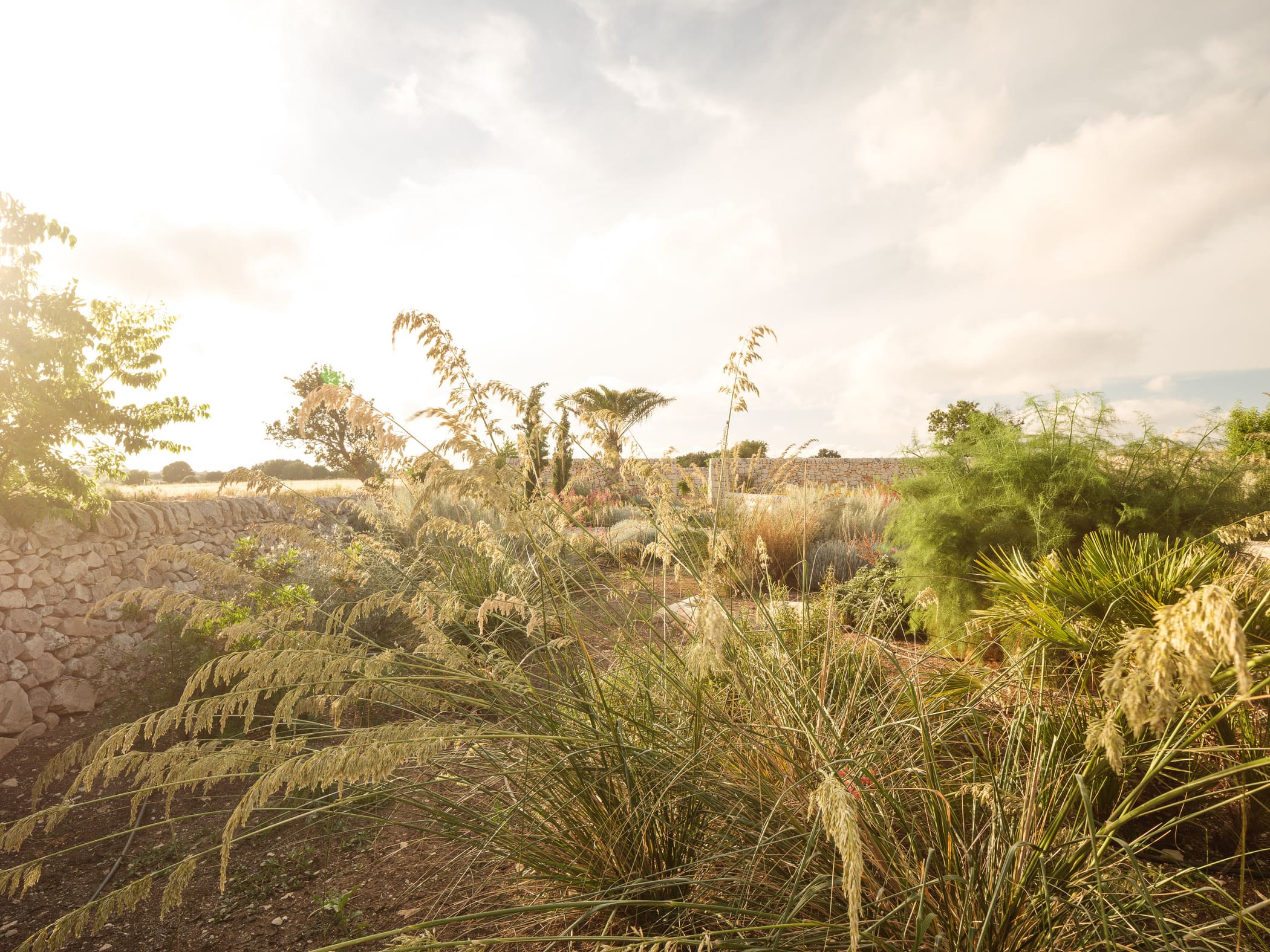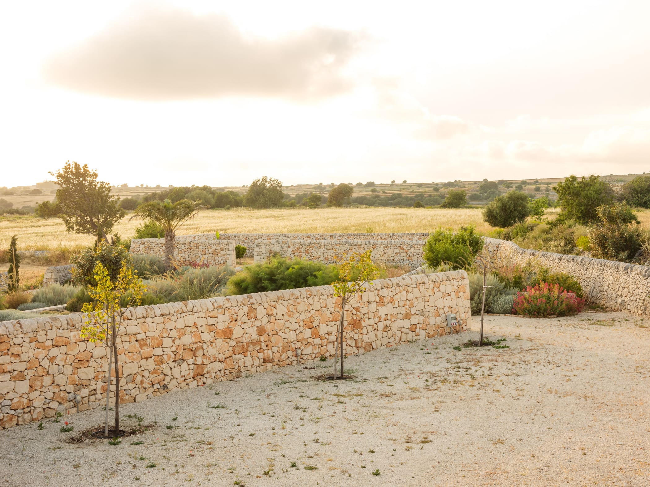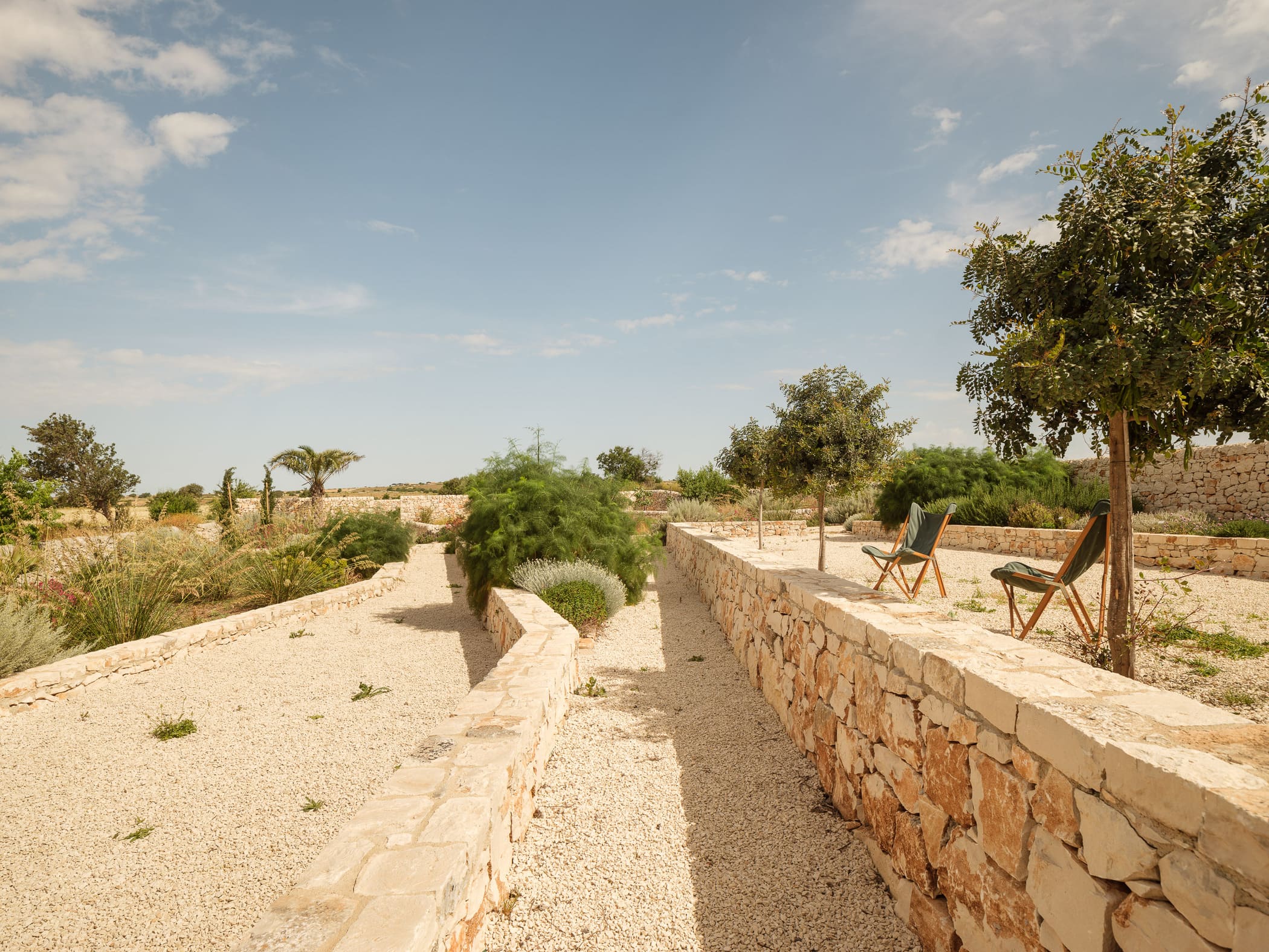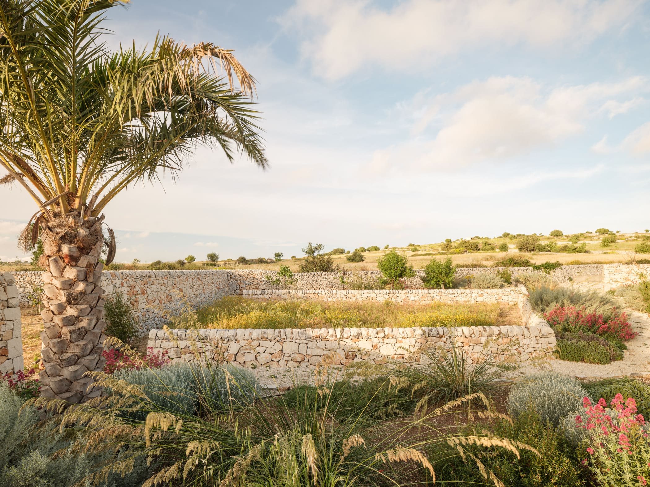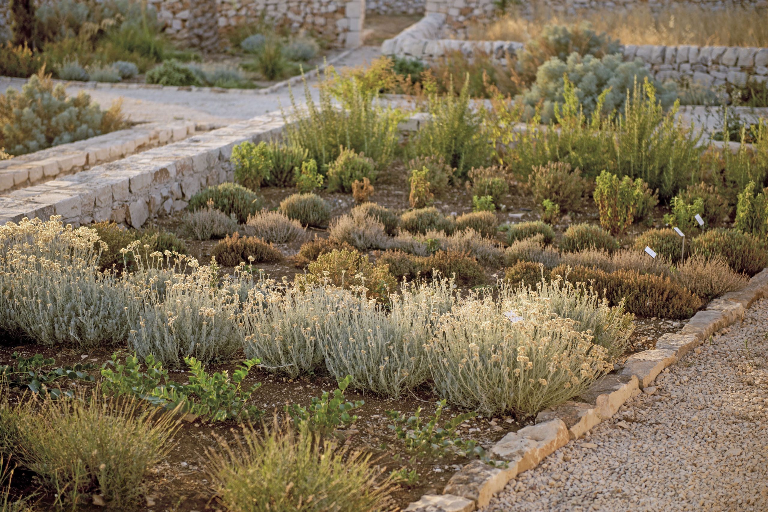 Las terrazas de muros de piedra seca, que descienden suavemente hacia el olivar al ponerse el sol, encierran una selección de 22 plantas aromáticas y crean varias zonas perfectas para aperitivos, paseos y eventos al aire libre.