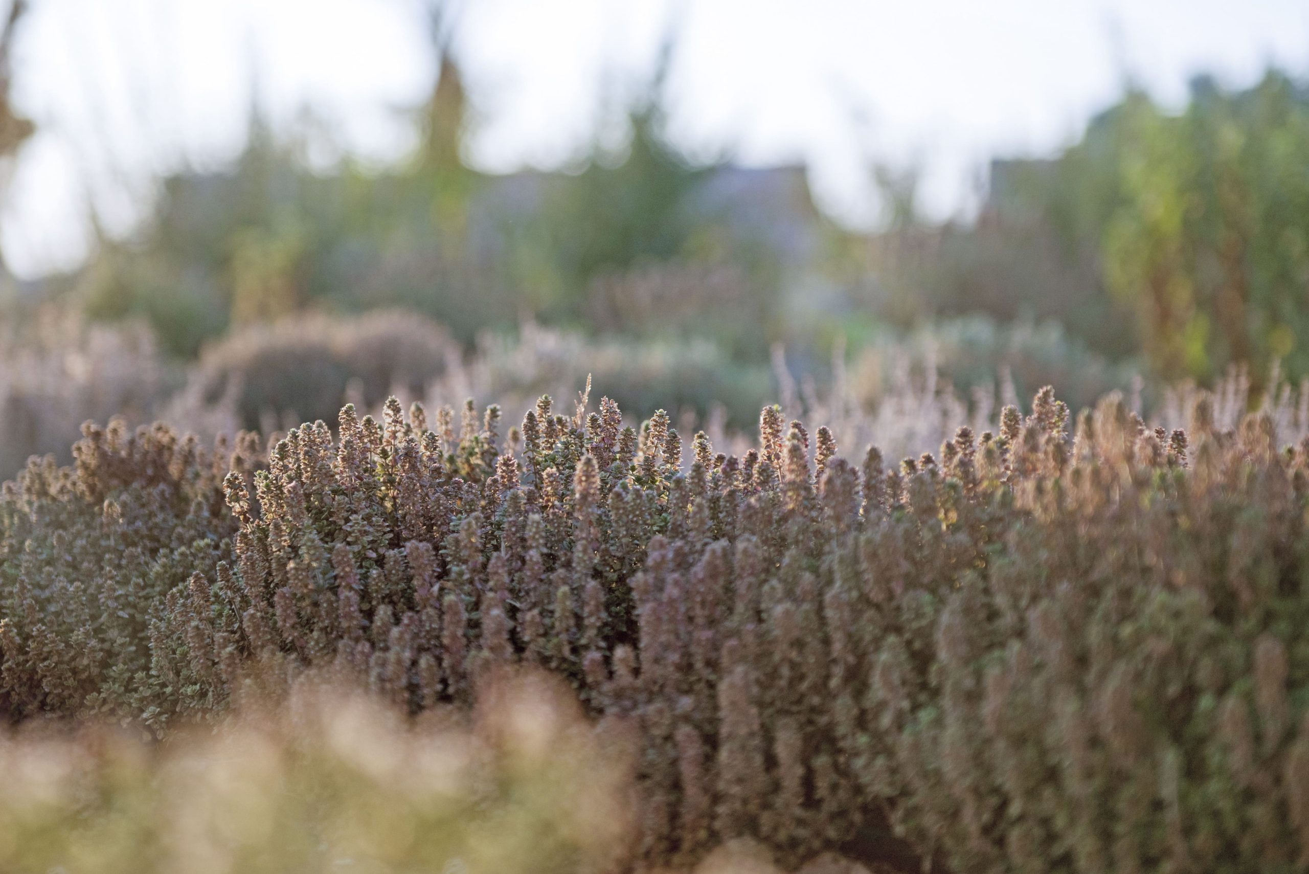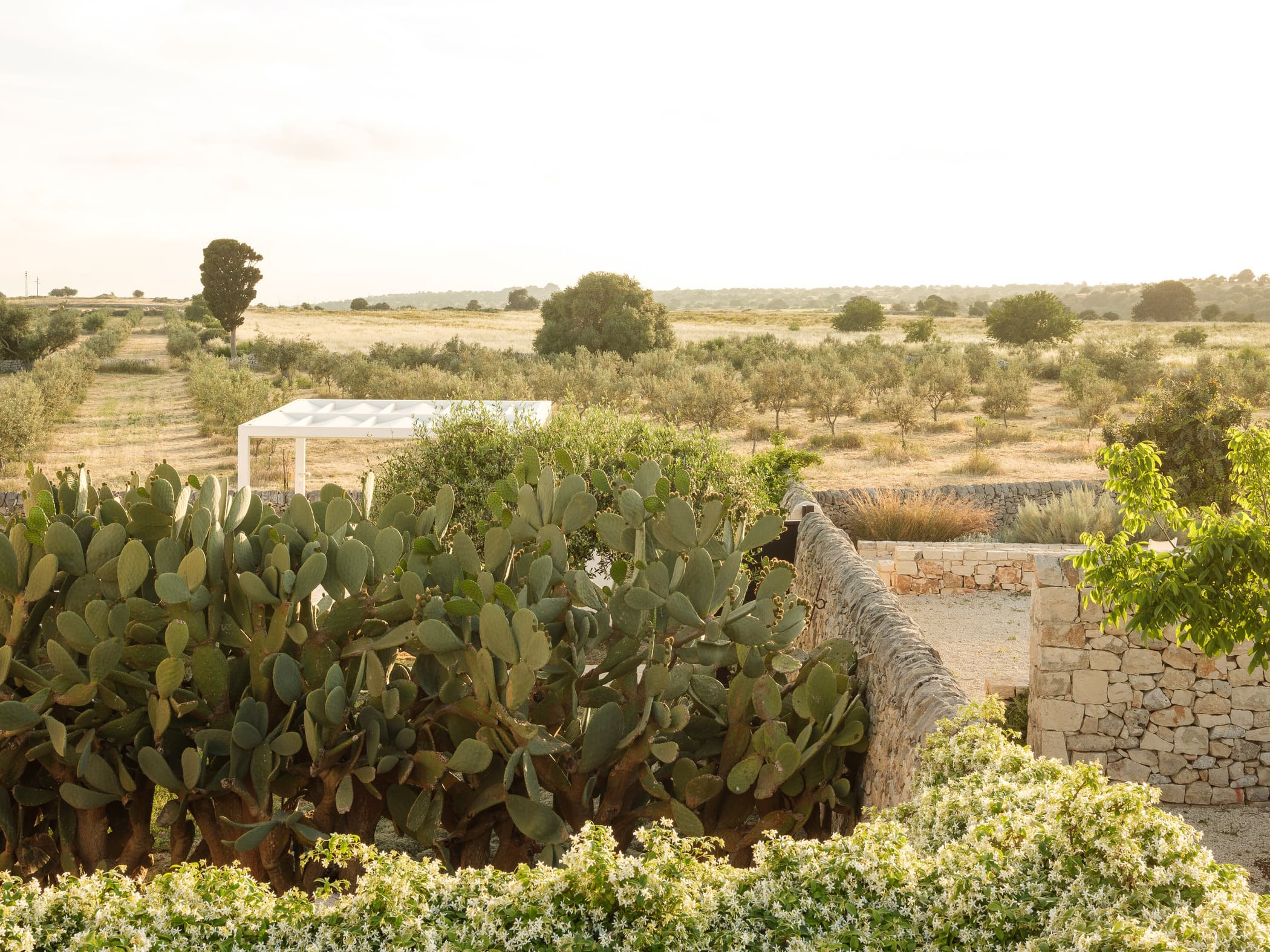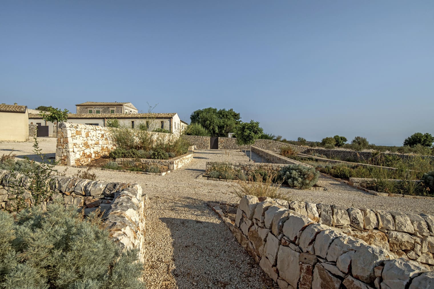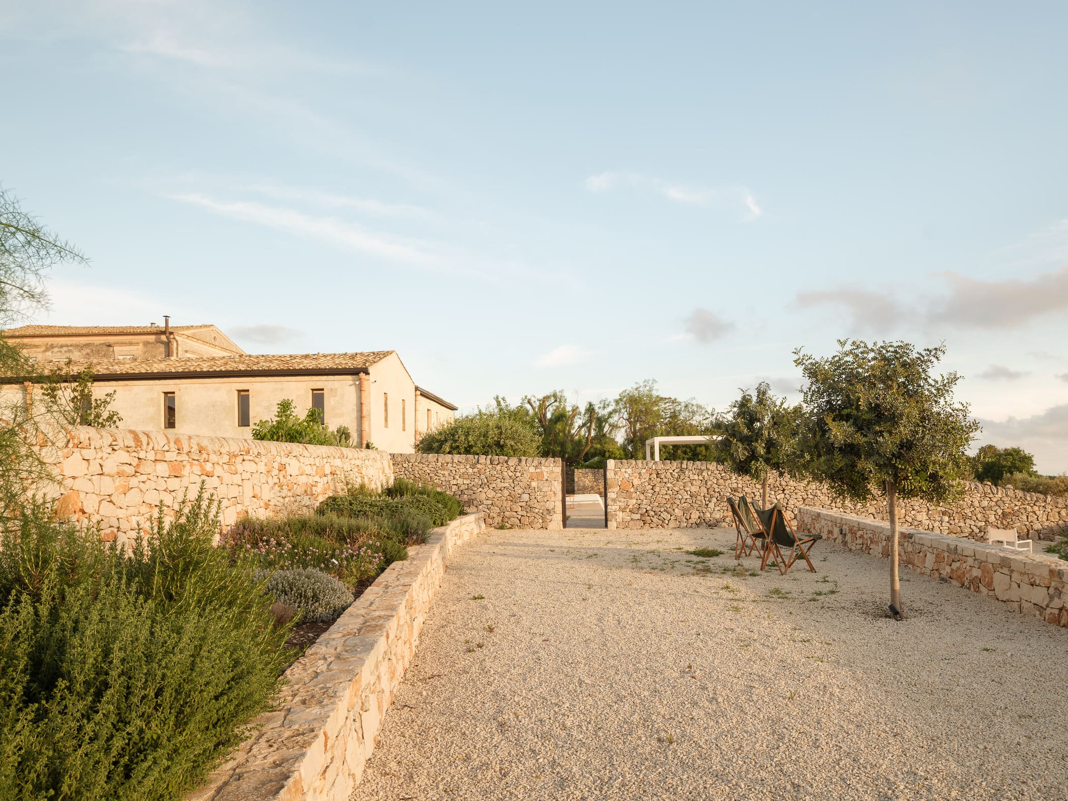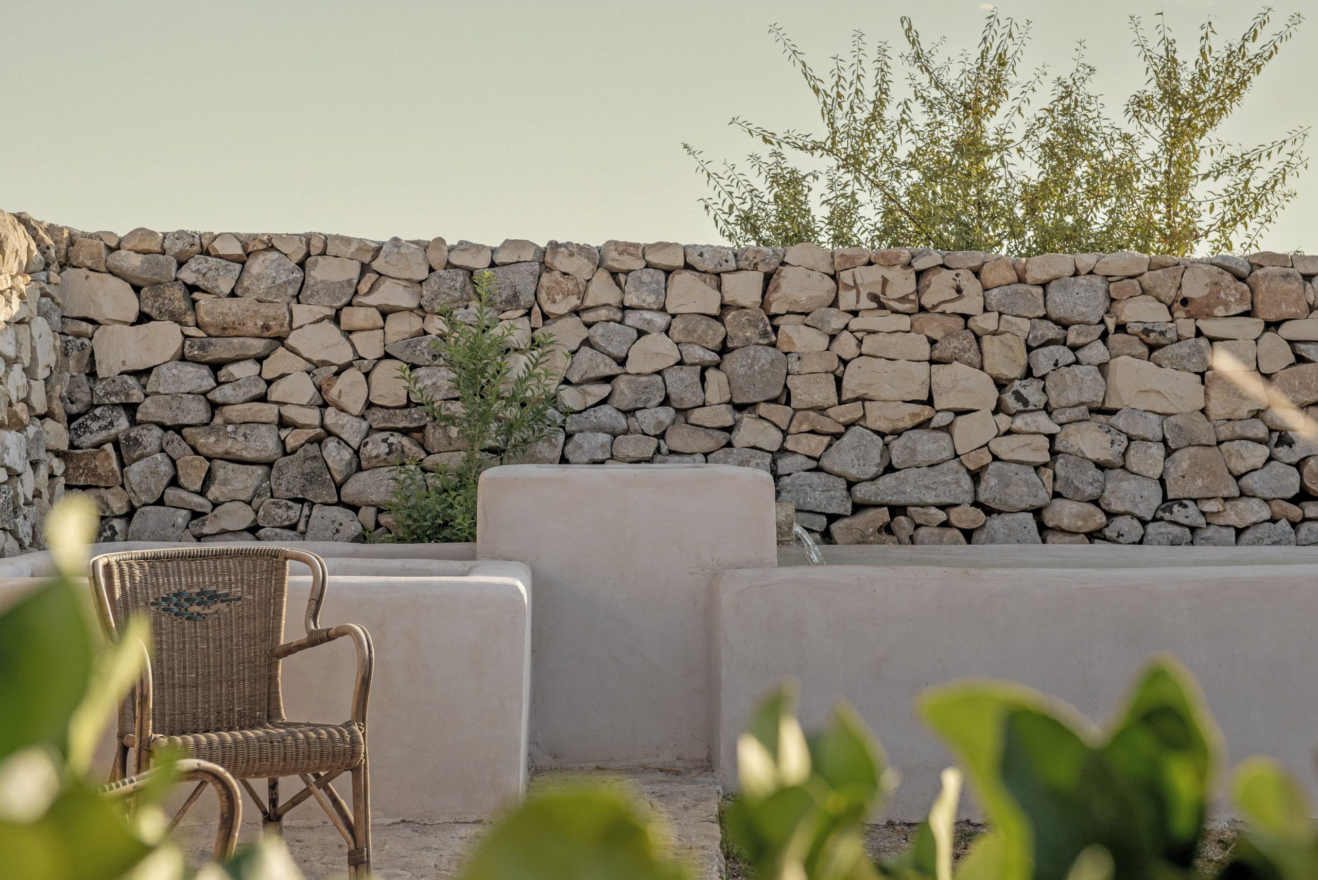 Las terrazas de muros de piedra seca, que descienden suavemente hacia el olivar al ponerse el sol, encierran una selección de 22 plantas aromáticas y crean varias zonas perfectas para aperitivos, paseos y eventos al aire libre.